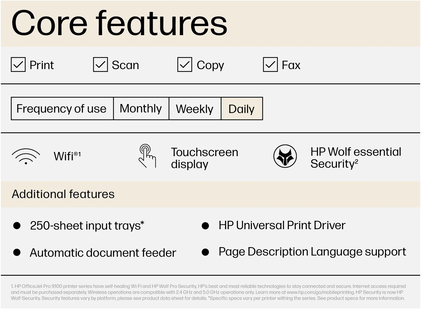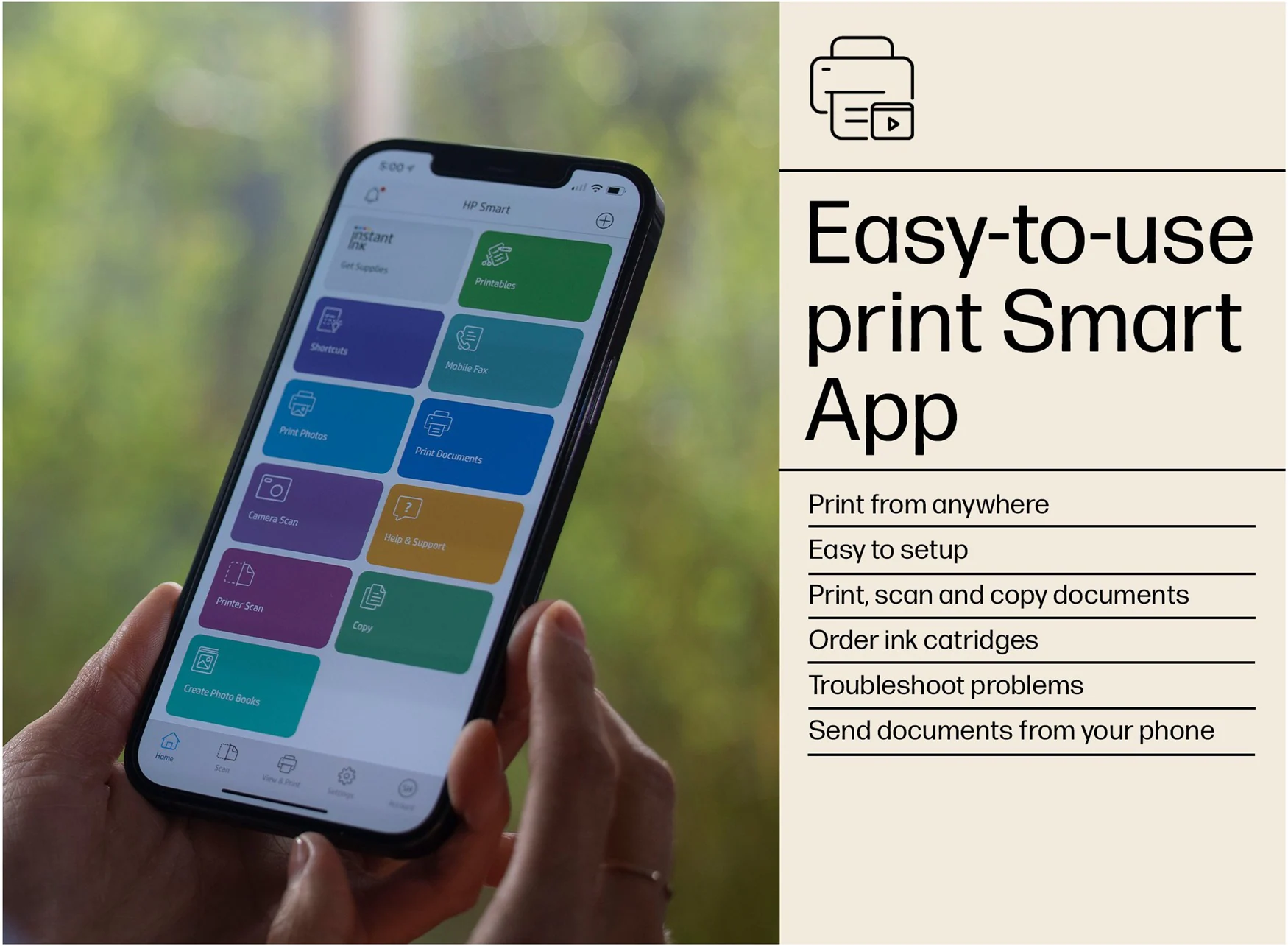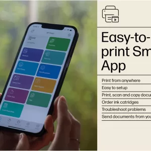 • HP+; HP Instant Ink eligible; Print from phone or tablet; Touchscreen; Smart Advance Scan; Instant Paper; Front USB flash drive port; Two-sided printing; Two-sided scanning; Automatic document feeder; Fax