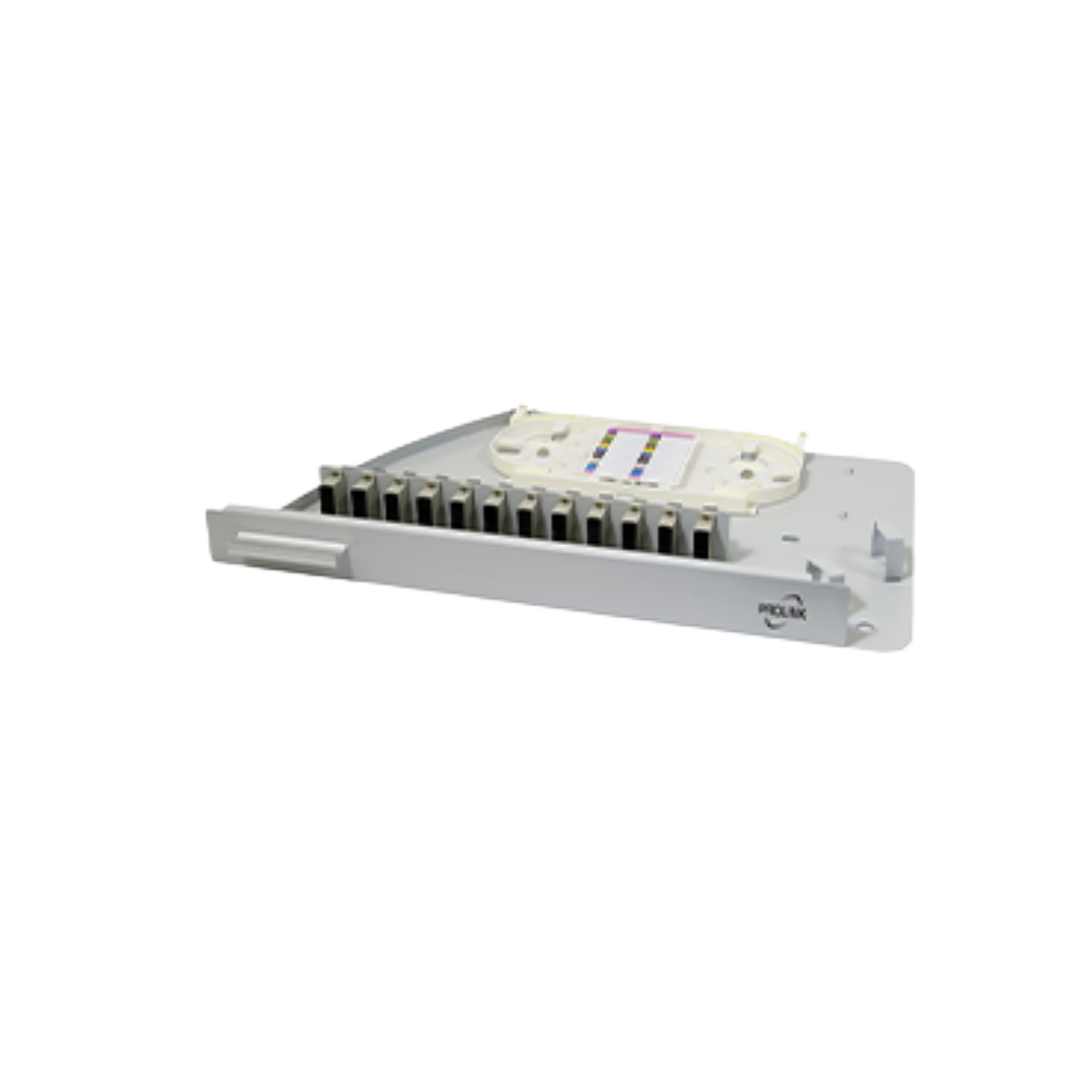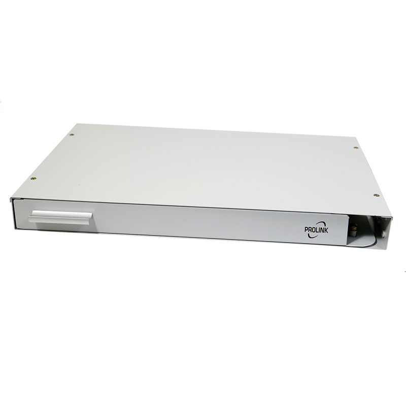 It is made of a 1U 19” cold-roll steel box, with a plastic splice Tray inside, suitable for pigtail, ribbon, and bunch cable distribution. And it has metal sliding fittings with self-locking functions to prevent the drawer from falling when moved.ProLink Fiber Distribution Frame, 24 Core swing 12 SC Duplex – Empty